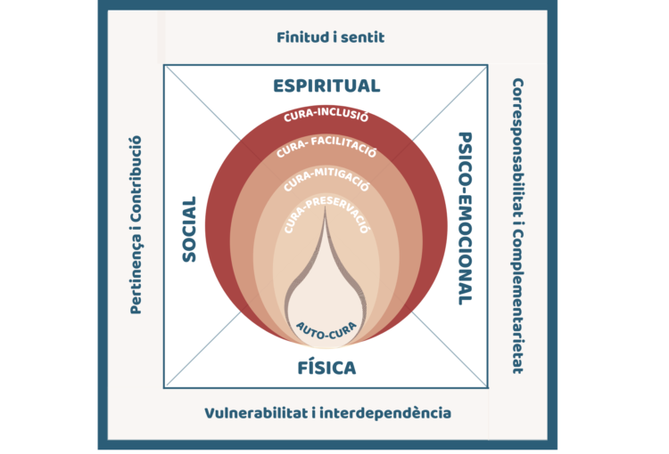 La cura implica consciència, emoció i acció. D’una banda, cuidar requereix fer-se sensible a les necessitats i els recursos propis i aliens, abraçant la nostra multidimensionalitat i integralitat. Les persones som la suma de 4 dimensions interrelacionades: